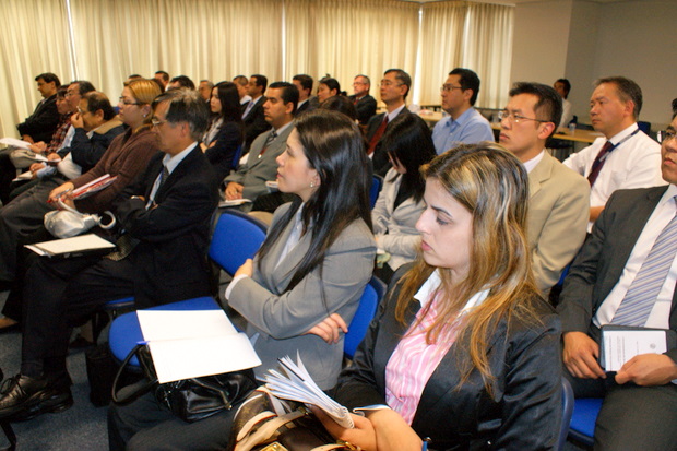 澤田所長自ら司会役を担当、ビセンチ・パウロ・ダ・シルバ連邦下院議員(全国的にビセンチーニョで親しまれている有力議員)をはじめ開発商工省(MDIC)のエドワルド・セリノ投資促進コーディネーター、環境省(MMA)のナビル・ボンドウキ局長、サンパウロ総領事館の大部一秋総領事の他、今回の政府側ミッションリーダーの経済産業省(METI)資源エネルギー庁三浦聡国際室長、民間側リーダーの田中嘉郎前川製作所株式会社社長が各々開会の挨拶を行った。