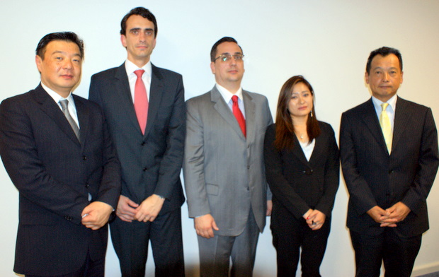 左からLautenschleger, Romeiro e Iwamizu 弁護士事務所のマリオ・イワミズ共営者/サンパウロ州建設業者組合(SINDUSCON)のセルジオ・ワタナベ会長/平田藤義事務局長/磐信総務人事部 石川エツオ法律顧問