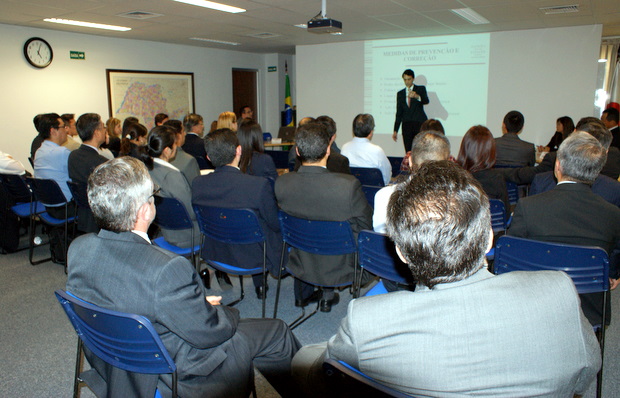 初めに磐信の高柳裕久専務理事が冒頭挨拶を行い、続いて平田藤義事務局長が ブラジル経済・日伯関係の歴史に始まり、今後の課題や動向並びに会議所活動について講演、サンパウロ州建設業者組合(SINDUSCON)のセルジオ・ワ タナベ会長がブラジルの建設業界について、また会議所会員企業のLautenschleger, Romeiro e Iwamizu 弁護士事務所のマリオ・イワミズ共営者が日伯二重課税防止協定や労働訴訟などについて講演、質疑応答では活発な意見交換が交わされた。