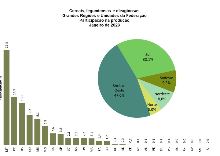 2023年のブラジル国内の地域別・州別の穀物生産比率予想