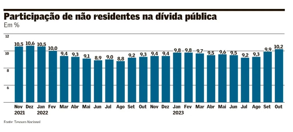 2023年10月の連邦公的債務(DPF)は、1,58% 増加の過去最高水準に接近する6兆1,710億レアルに達したと国庫庁の公的債務業務管理調整官であるロベルト・ロバリニャス氏が今週水曜日に発表した。