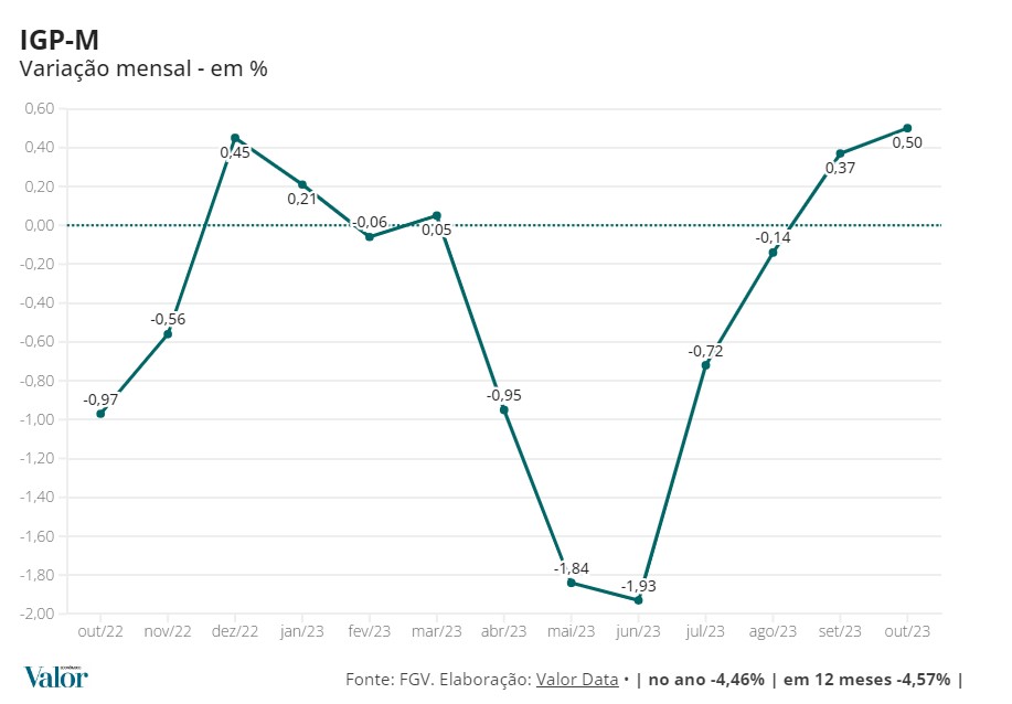 ジェツリオ・ヴァルガス財団ブラジル経済研究所(Ibre/FGV)のインフレ調査によると、2023年10月の住宅賃貸料調整基準となるインフレ指数の総合市場物価指数(IGP-M)は、前月の0,37%を大幅に上回る0,50%を記録している。