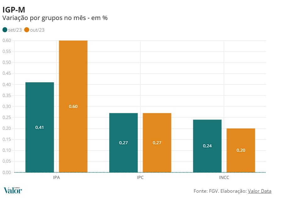 IGP-M の 30% を占める10月の消費者物価指数 (IPC-M) は9月と同率の0.27%、指数を構成する 8 グループのうち、5 グループは変動率が増加し、2 グループは減少し、1 グループは前月と同じ率を維持した。