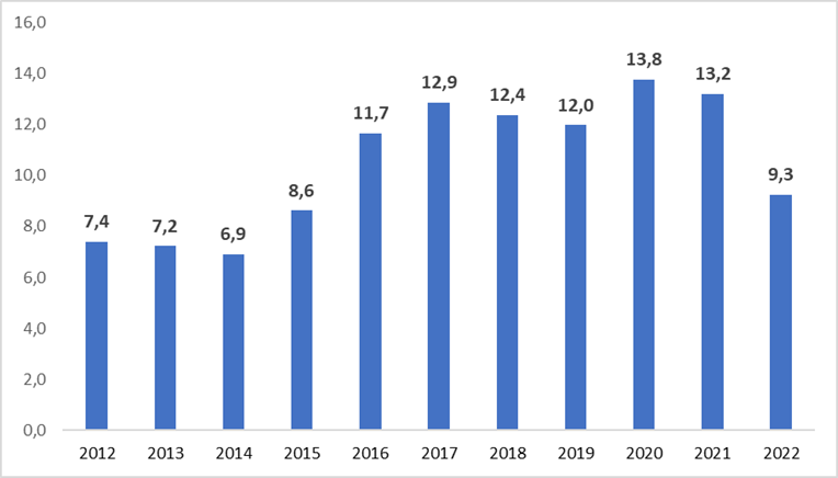 一方昨年の製造業部門のGDP伸び率は金利の上昇及び製造コストの上昇の影響を受けてマイナス0.3%を記録、特に金属セクター、家具セクター、木材セクター、ゴム・プラスティックセクターがマイナスを牽引、鉱業セクターは中国のロックダウンの影響が牽引してマイナス1.7%を記録している。