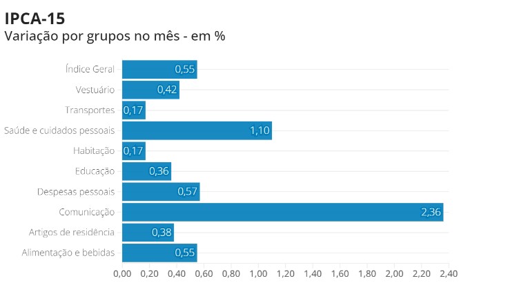 インフレ指数の広範囲消費者物価指数(IPCA-15)は、ブラジルの正式なインフレ指数の広範囲消費者物価指数(IPCA)の予想として先行して発表、1最低サラリーから40最低サラリーの所得層を対象に調査、ブラジリア連邦直轄地とゴイアニア市の地方自治体に加えて、9大都市圏を対象に調査されている。